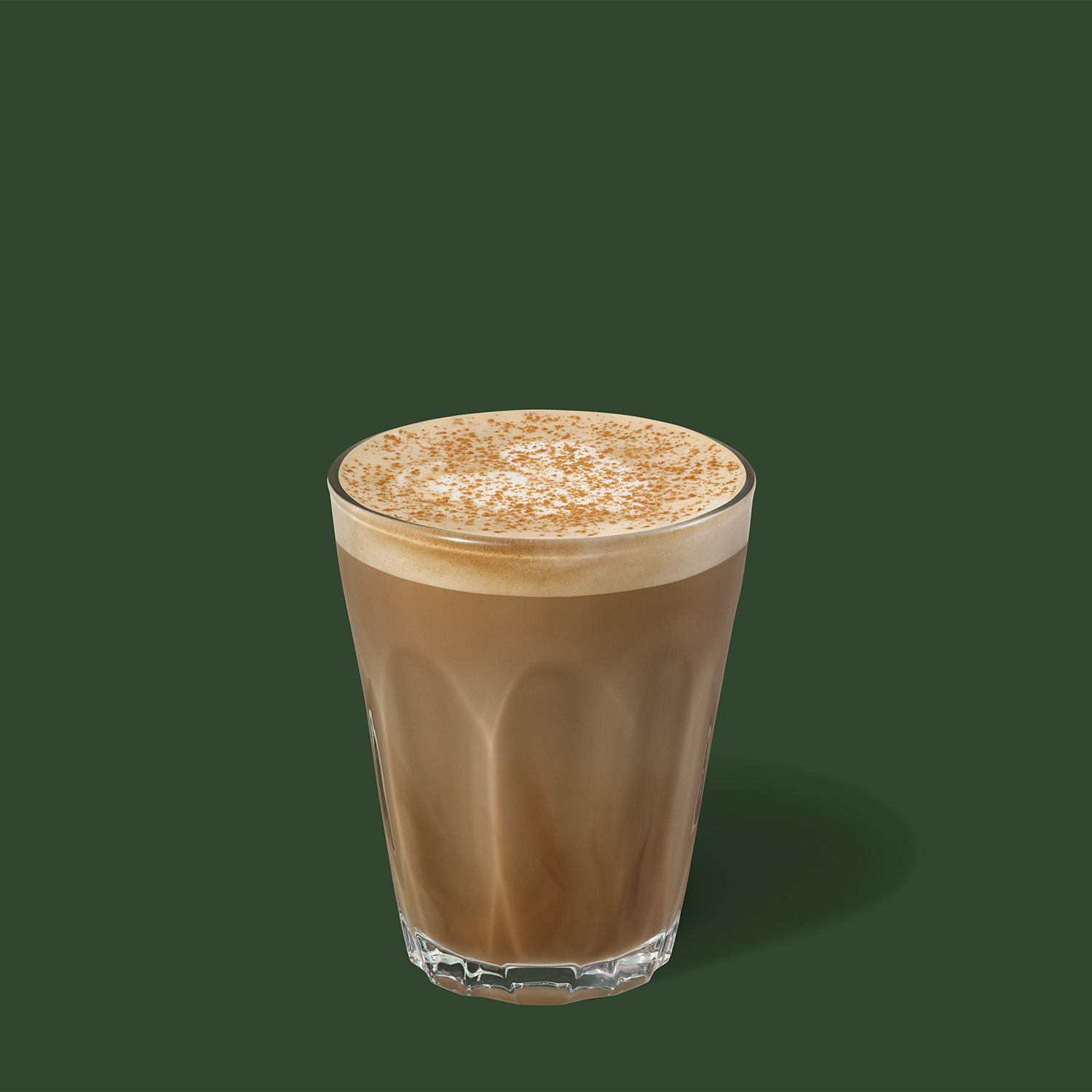 Doppio espresso con bevanda all’avena, sciroppo allo zucchero di canna e cannella.