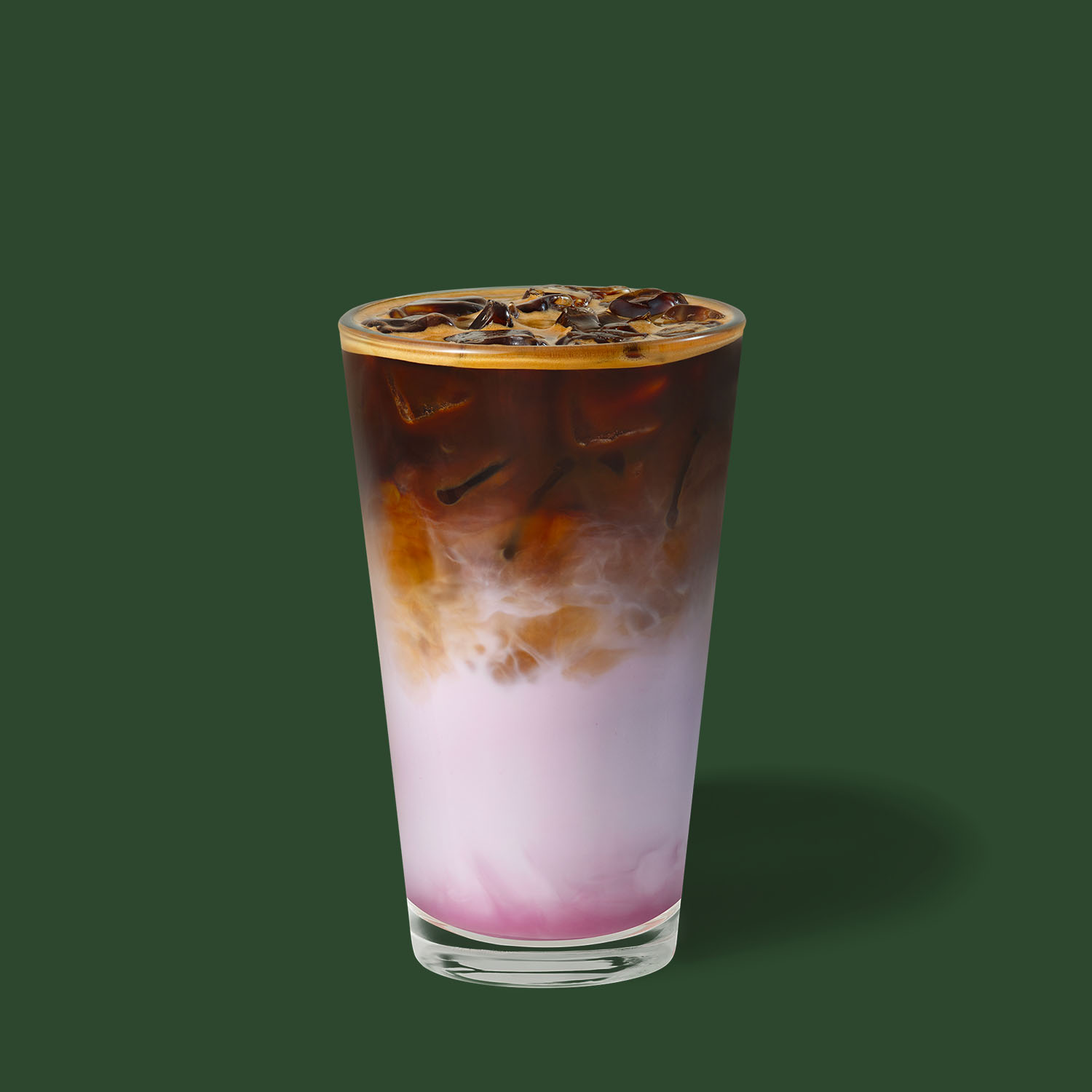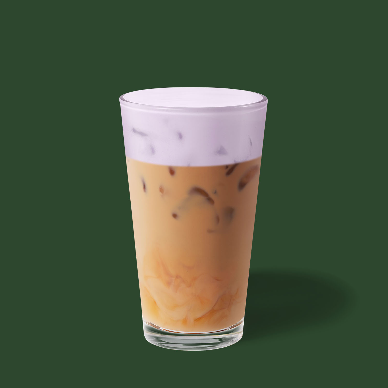 Caffellatte freddo con schiuma fredda a base di latte e salsa al gusto di vaniglia e ube.