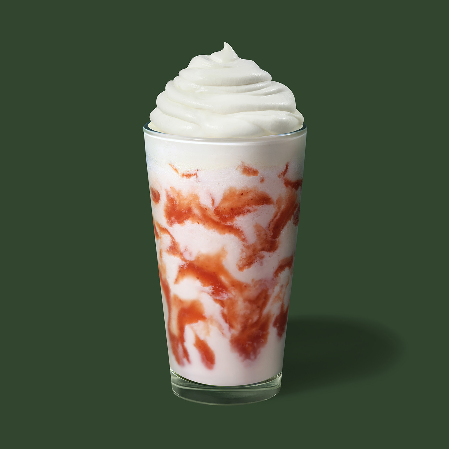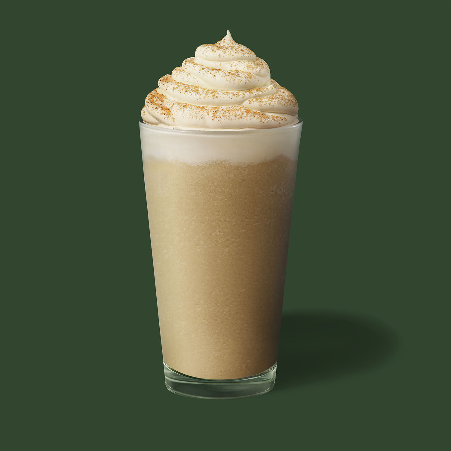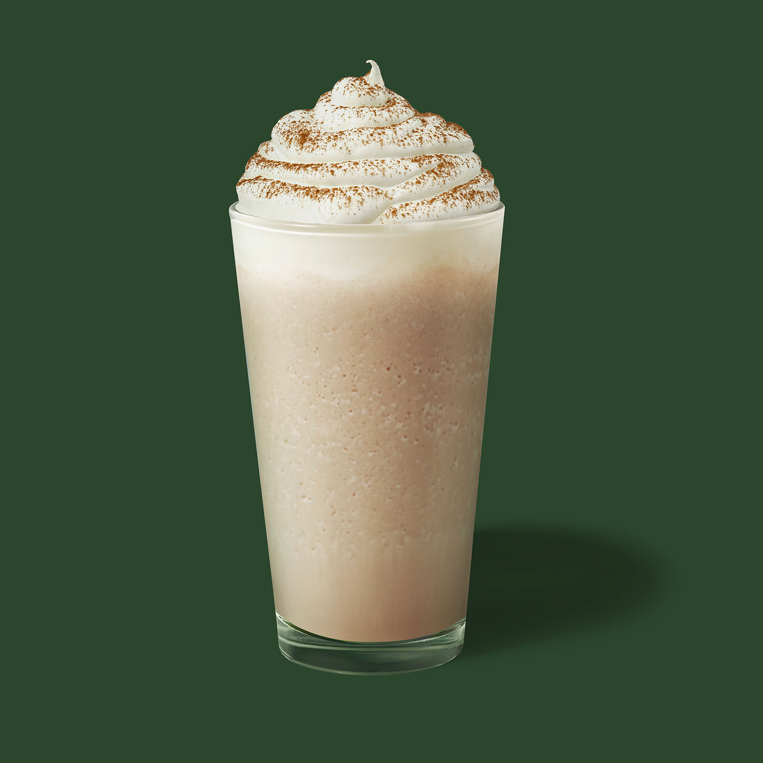 Frappuccino® al gusto di tè nero e spezie dolci come cannella e chiodi di garofano decorato con panna montata e topping di cannella.