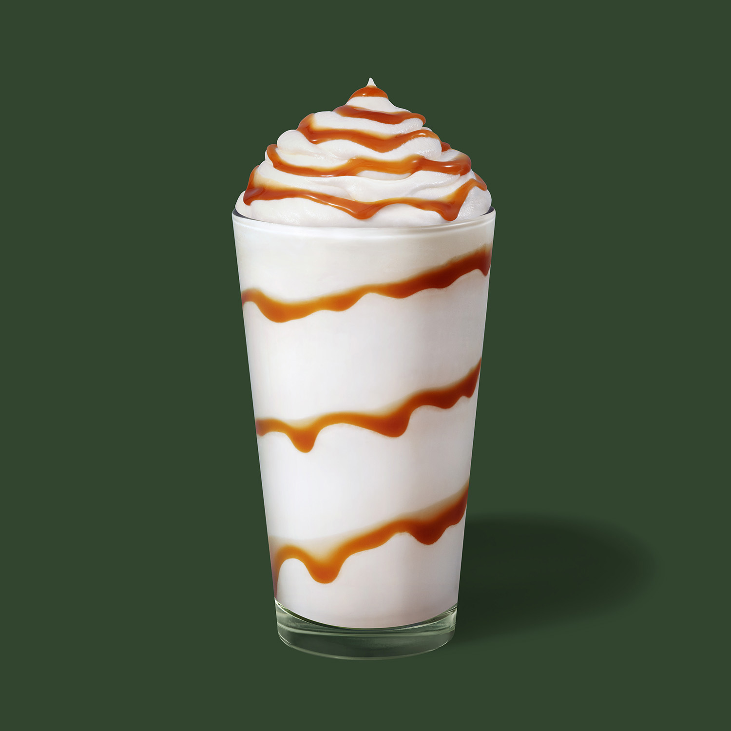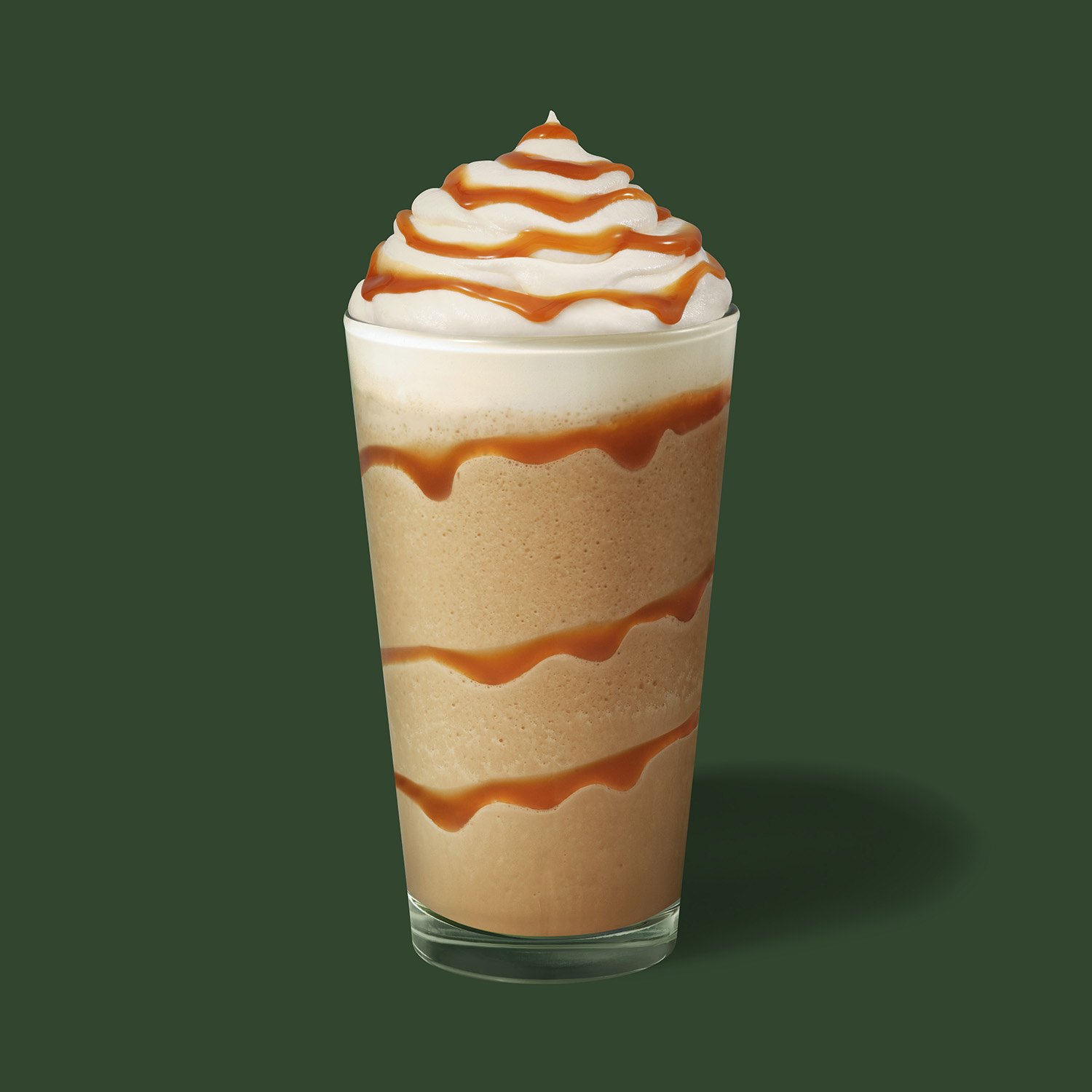 Frappuccino® al caramello decorato con panna montata e topping di caramello