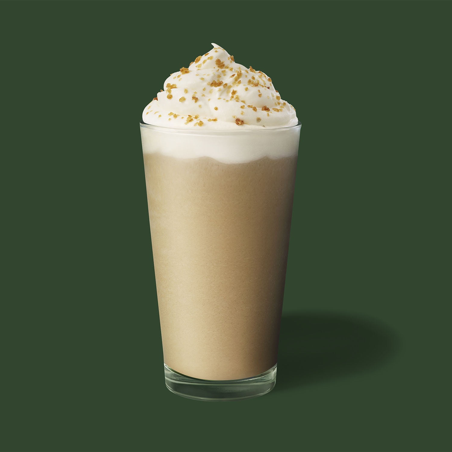 Frappuccino® al gusto di noccioline tostate e caramellate decorato con panna montata e granella di noccioline caramellate.