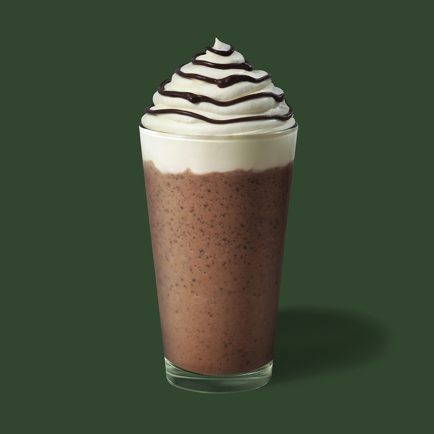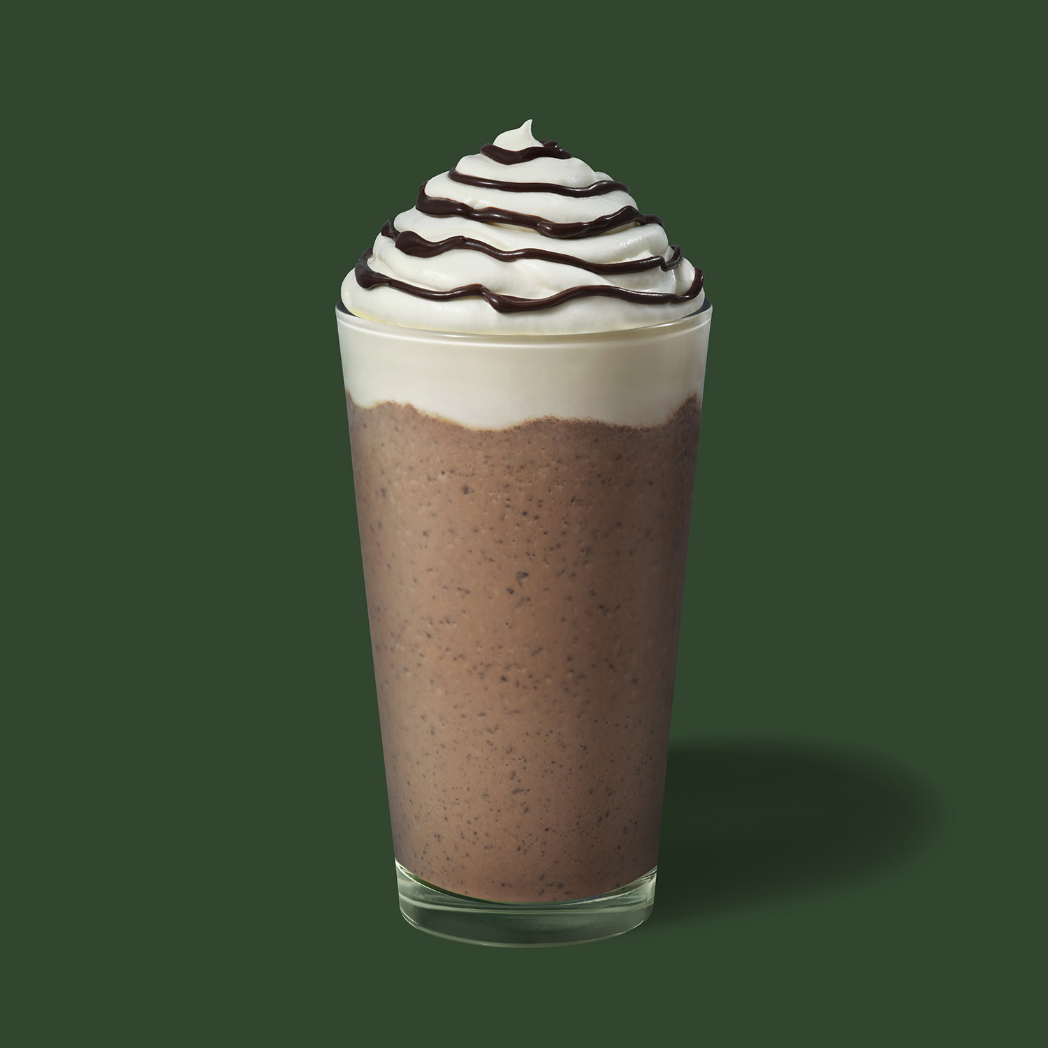 Frappuccino® a base di caffè con scaglie di cioccolato, salsa al cioccolato e decorato con panna montata e topping di cioccolato
