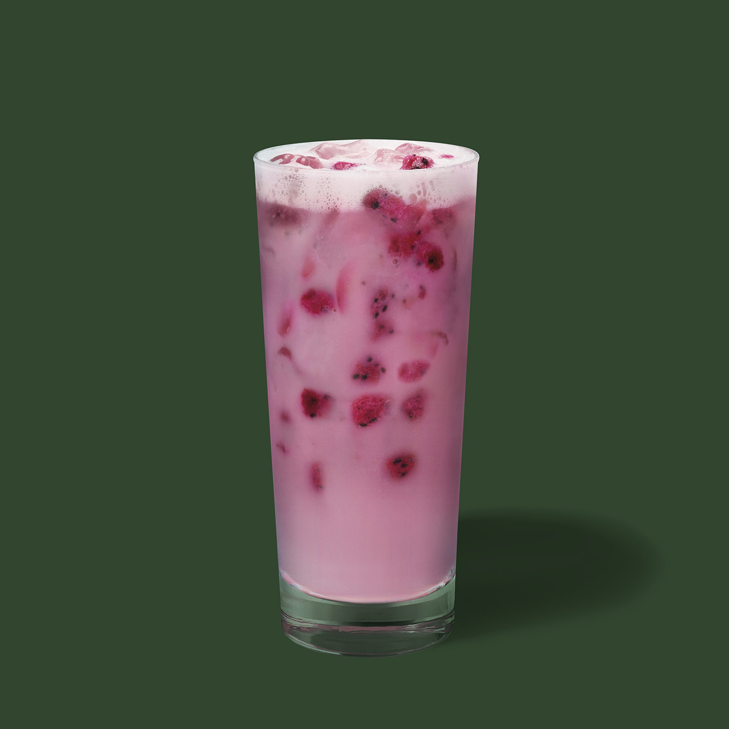 Una bevanda fresca dal dolce sapore di mango e dragonfruit con pezzetti di dragonfruit, finita con bevanda vegetale a base di cocco.