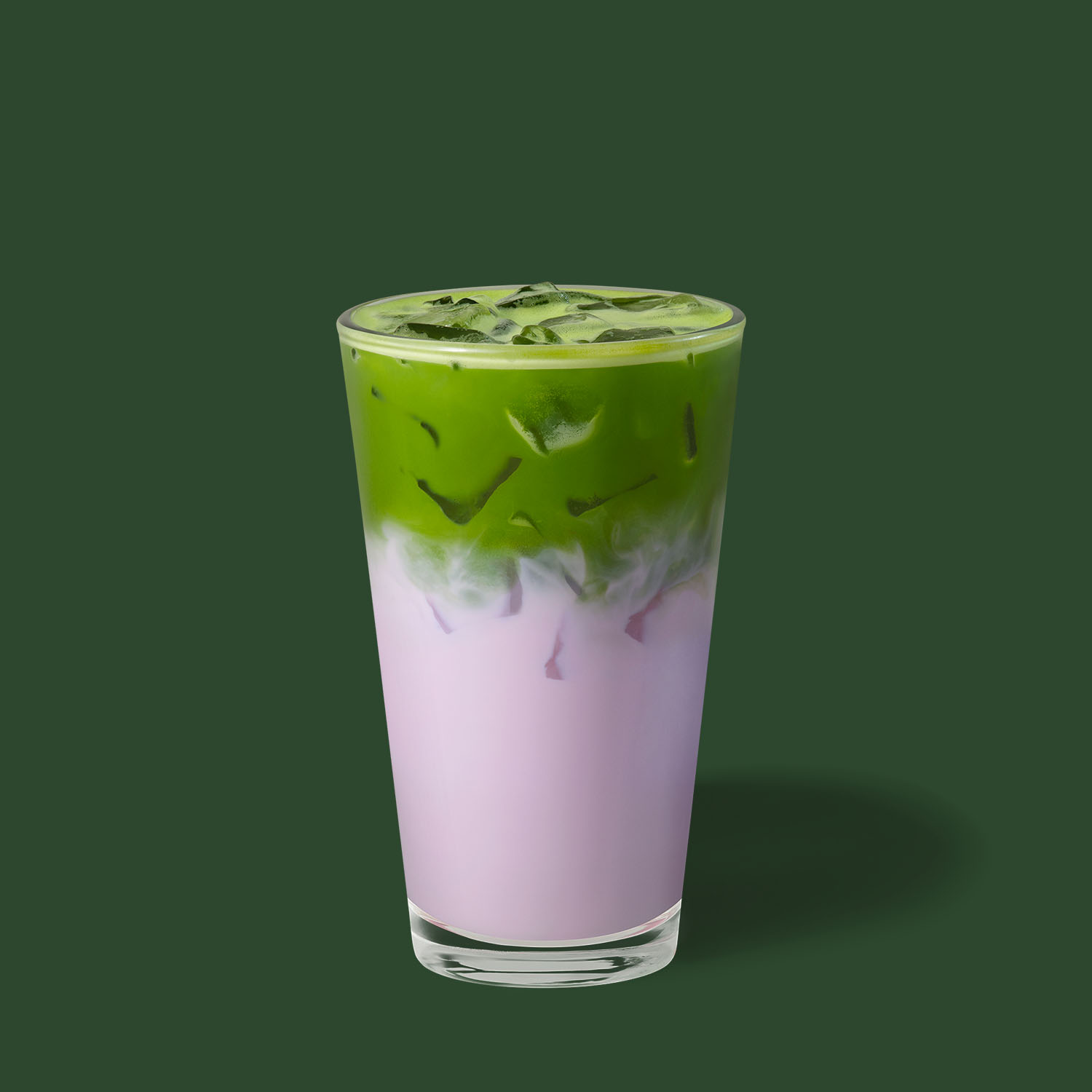 Matcha tè latte freddo con salsa al gusto di vaniglia e ube.