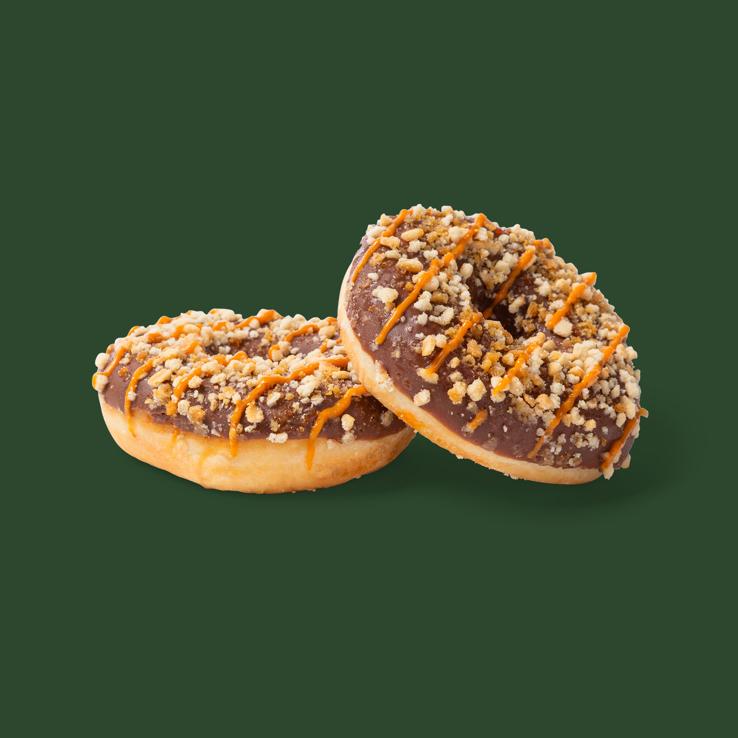 Donut con farcitura al caramello, ricoperto di cioccolato e decorato con caramello e crumble al caramello salato