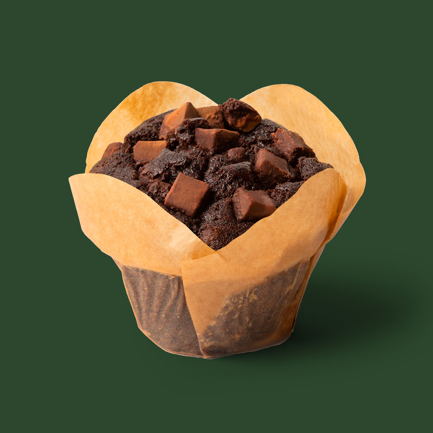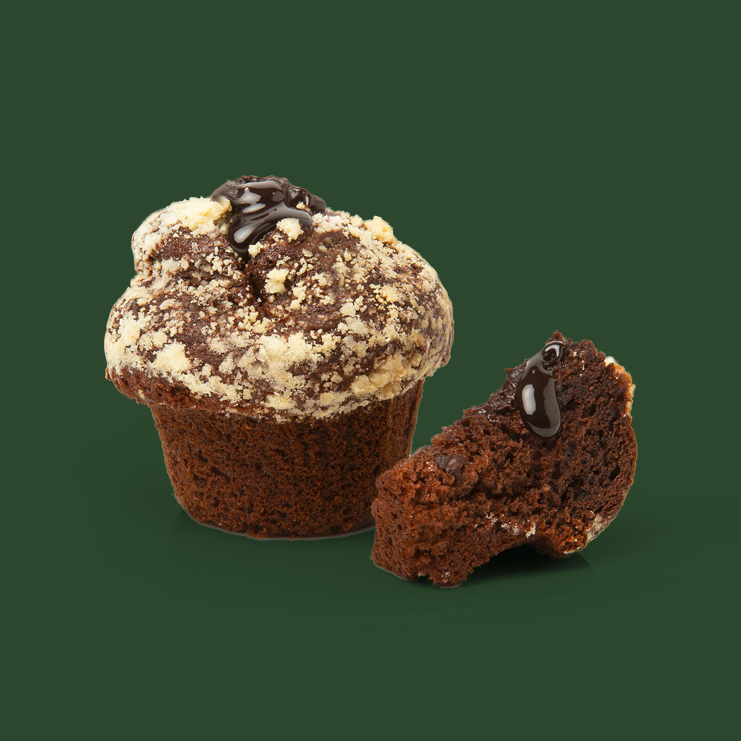 Soffice muffin con impasto di cioccolato, arricchito con crema e gocce di cioccolato e decorato con crumble.