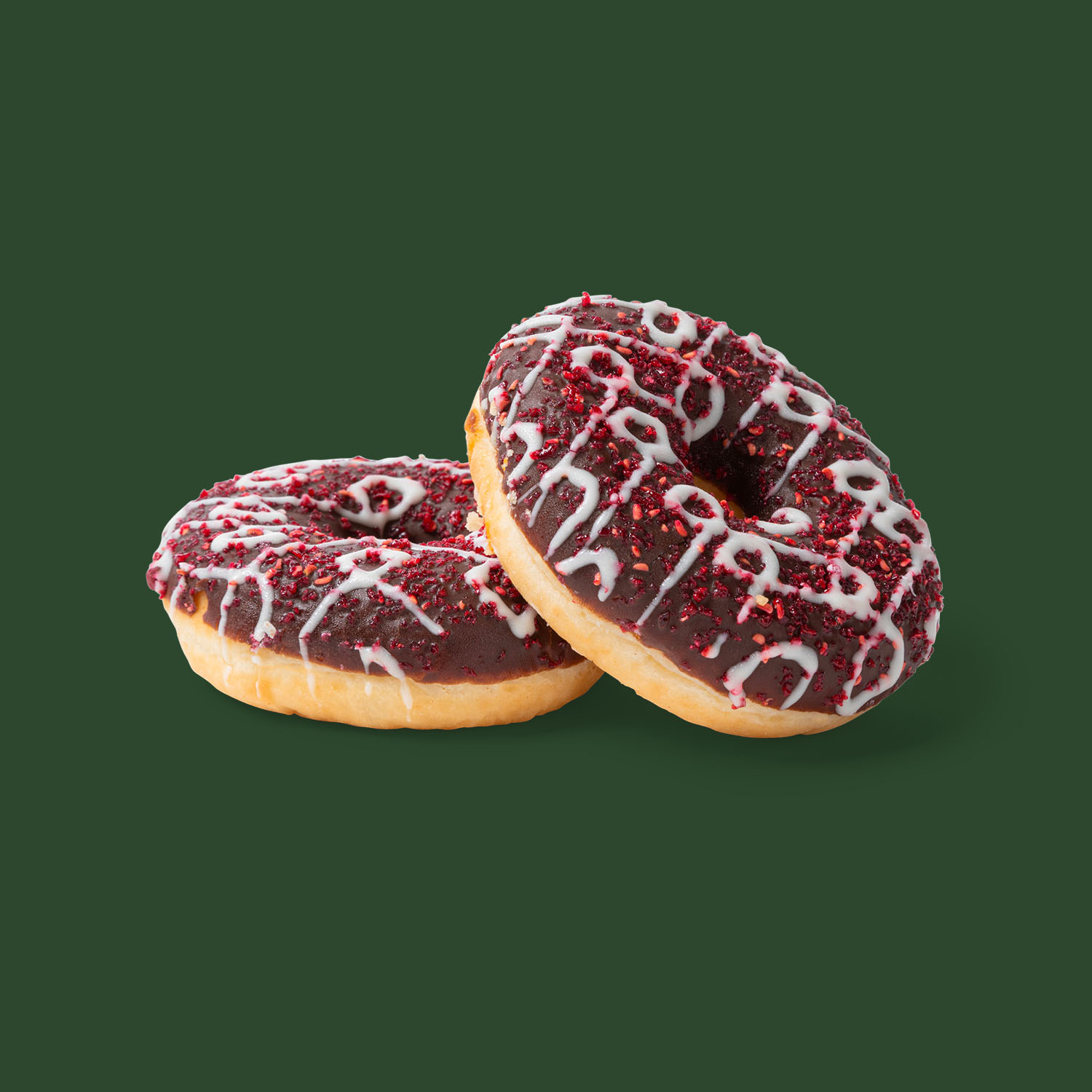 Donut con farcitura al lampone e cioccolato, ricoperto di cioccolato e decorato con glassa bianca e lamponi liofilizzati