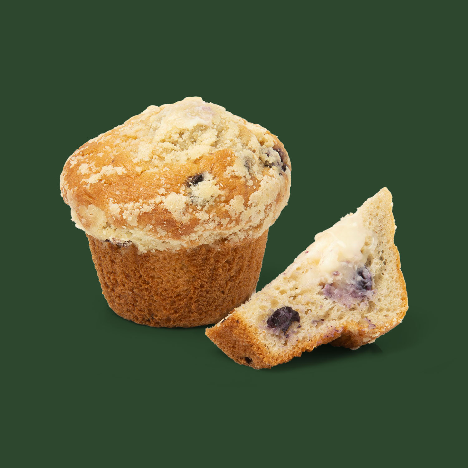 Muffin con impasto classico e mirtilli, con topping al crumble.