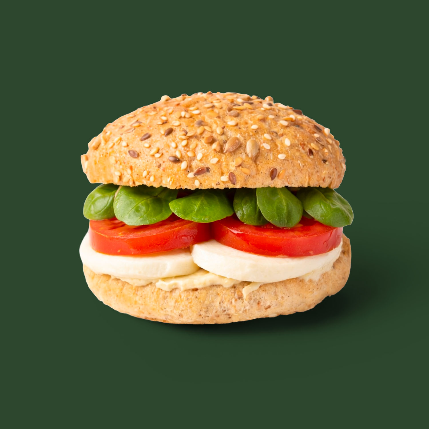 Una nuova ricetta vegetariana: pane burger ai semi farcito con spalmabile fermentato vegano a base di anacardi e basilico, mozzarella, pomodoro e valeriana.
