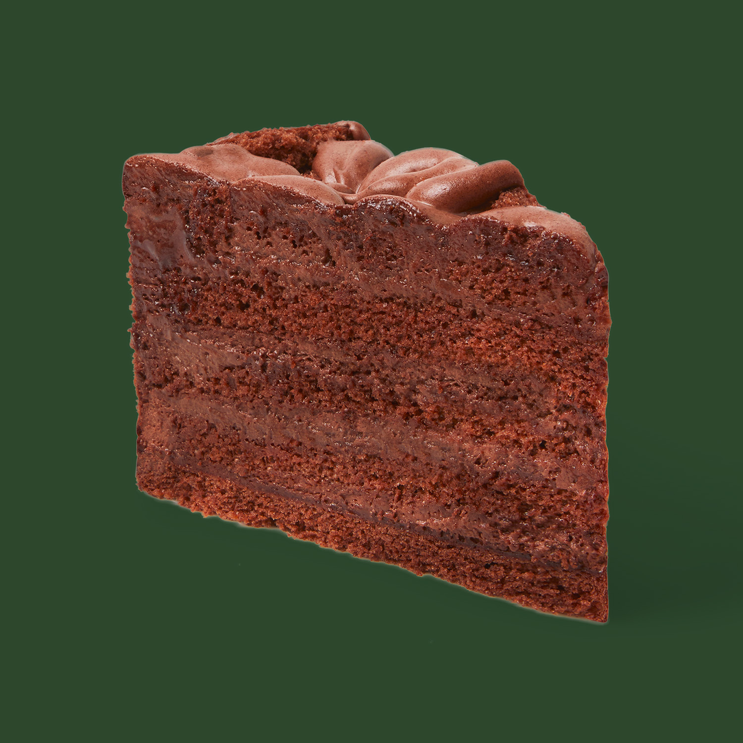 Due soffici strati di pan di spagna al cacao ripieni con crema al cioccolato, decorati con fiocchi di cioccolato.