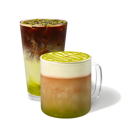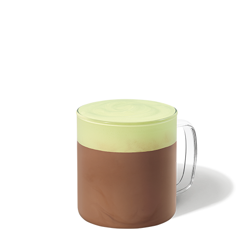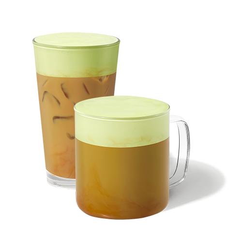 Matcha Tè Latte con schiuma a base di latte al gusto di pistacchio, versione calda e fredda.