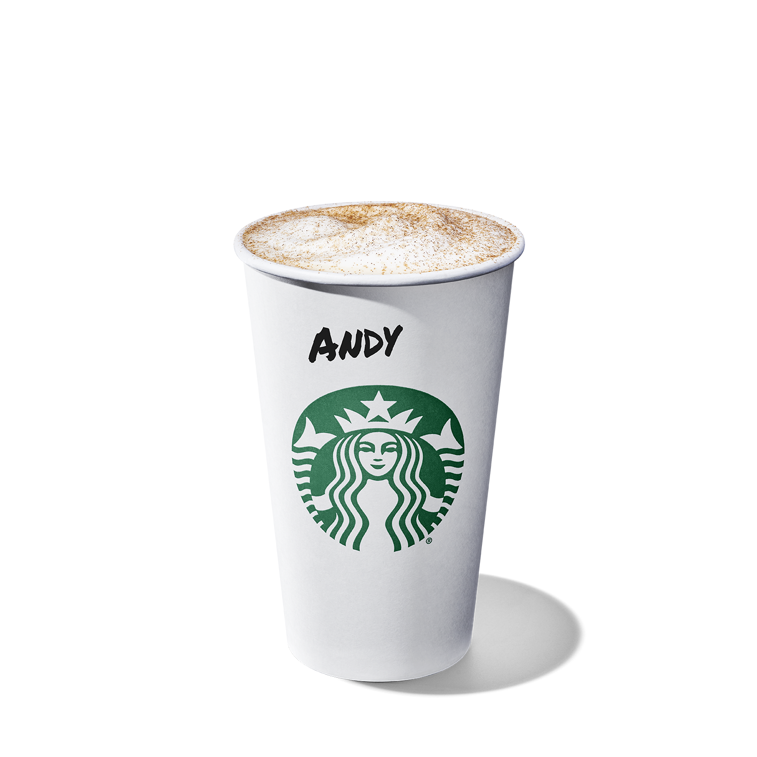 Cappuccino con bevanda all’avena, sciroppo al gusto di caramello e una spolverata di cannella.